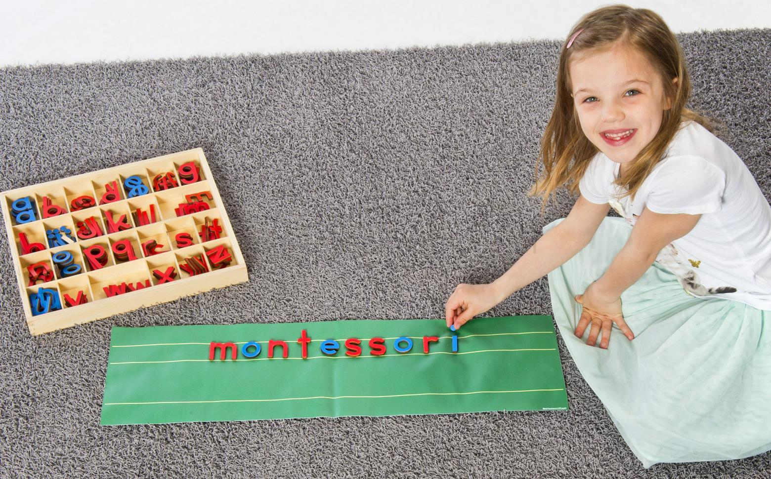 Każde dziecko chce nauczyć się czytać i pisać! Dzieci zaczynają literować swoje pierwsze słowa, używając liter ruchomego alfabetu. Dźwięk litery określa poprawne słowo. Na przykład „Boat” to pierwsze poprawne słowo dla słowa „boot” (łódź), ponieważ drugie „o” nie jest słyszalne dla dziecka. Mata z literami pomaga wyznaczyć obszar roboczy i zapewnia praktyczne linie ułatwiające czytanie.